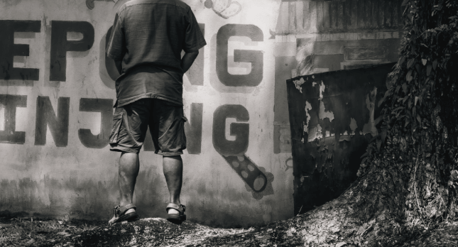看着壁画找角度时,他走进我的取景框, 中午的光像聚光灯一样落在他身上。随后 发生了个出乎意料的小动作——厕所其实 就在不远处。那一刻我想,也许摄影之神 不只会安排光位,还会安排剧情。